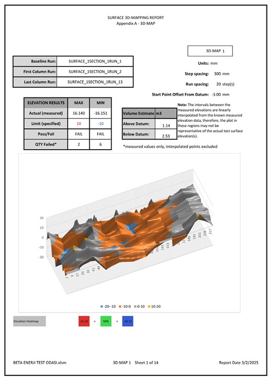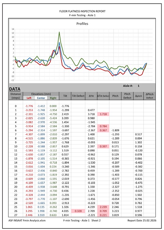 Post-measurement evaluation reports present not only numerical data but also floor behavior and operational impact in a clear and comparable format. All slopes and deviations are calculated with millimetric precision. Non-compliant points are visually marked. Results are compared with forklift supplier tolerances or relevant international standards. Reports are structured to directly guide the floor correction strategy and implementation plan